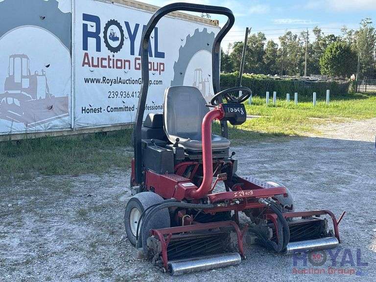 City of Ft Lauderdale (10048) SN: 316000649, Hours Read: 8,875 hours. Powered by a 18HP Briggs and Stratton Vanguard Gasoline Engine, Hydrostatic Drive. Equipped with three reel cutting decks, 60in total cutting width, adjustable throttle, PTO switch, hydraulic deck height adjustment, lever directional controls, 2-post ROPS. Runs, drives, and operates, Limited function check completed at check in.