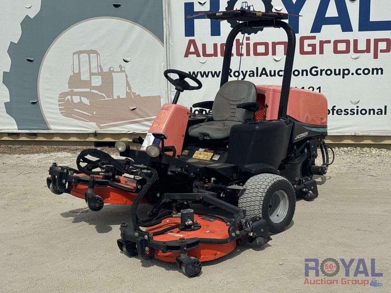 SN: KG000379 Hours Read 2,400 hrs. Powered by a Kubota D1105 1.1L 3 cylinder diesel engine, hydrostatic drive. Equipped with three 27 rear discharge floating decks, 67.5 in. cutting width, adjustable throttle, ROPS, 4 acre per hour cut time. Runs, drives and operates. Limited function check completed at check in.