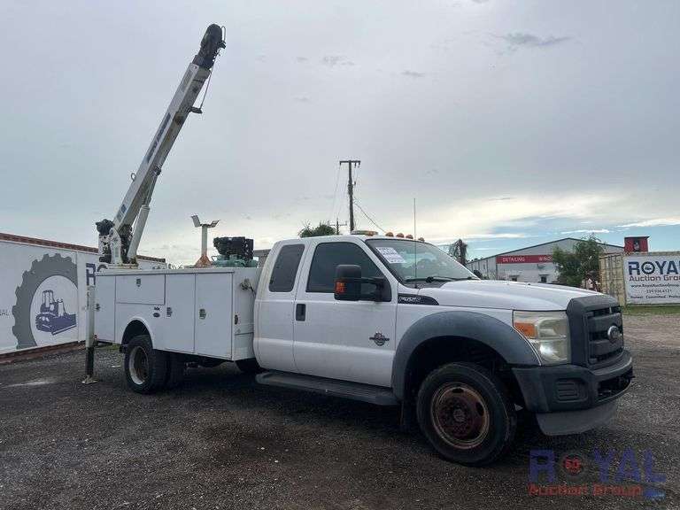 Charlotte County BOCC; VIN:1FD0X5HT6DEB47175 Odom Reads 113,573 miles, pwd by Powerstroke 6.7L V8 turbo diesel engine, automatic transmission. Equipped with: Auto Crane 6406H crane boom, 6,400 lbs lifting capacity, service body w/ cargo compartments, four wheel drive 4WD, tow package, hydraulic stabilizers, Speedaire compressor, dual rear wheels, running boards, extended cab, pwr windows, mirrors and locks, steering wheel cruise, auxiliary switches, am/fm stereo, AC/heat. Runs and drives. Limited function check completed during check in.