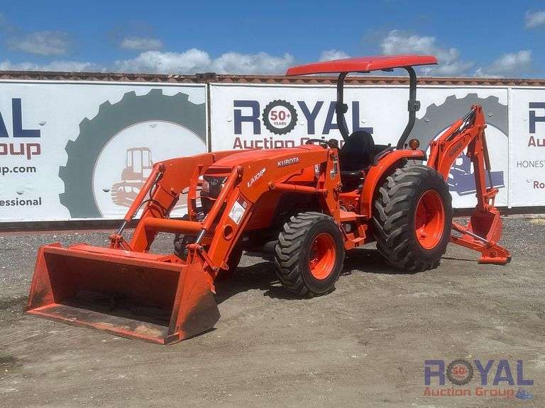 SN:A7495 Hours Read 3,439, pwd by Kubota 4-cylinder diesel engine, hydrostatic transmission. Equipped with: LA1065 front loader arm w/ bucket, dipper plumbed for hydraulics w/ 16in tooth bucket, rear hydraulic stabilizers, four wheel drive 4WD, pedal and wheel throttle, work lights, 2-post ROPS w/ canopy. Runs, drives and operates. Limited function check completed during check in.