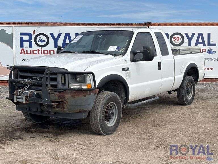 Lee County Fleet Management (49198) VIN: 1FTNX21L74EA01970 Odom reads 143,767 miles. Pwd. by 5.4L V8 gas engine, automatic transmission. Equipped with four wheel drive, 4WD, tow package, bed liner, nerf bars, diamond plate tool boxes, front mounted winch, pwr. windows and locks, steering wheel cruise control, am/fm stereo with cassette player, heat and a/c, auxiliary light switches, 12v charger. Runs and drives. Limited function check completed at check in.