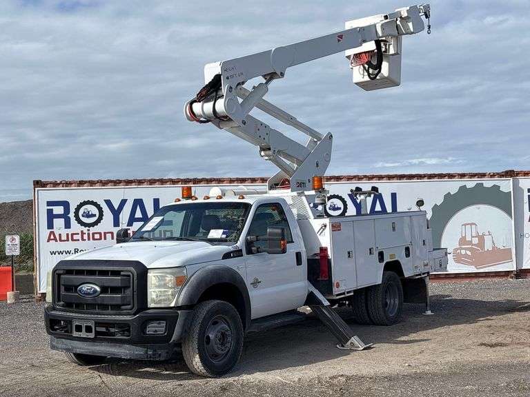 VIN: 1FDUF5HTXFEA65439, Odom Reads: 112,576 miles,mileage on title reads exempt pwd by Powerstroke 6.7L V8 turbo diesel engine, automatic transmission. Equipped with: ETI ETCMH37IH bucket boom, 37ft platform height, 400lb platform capacity, ETI service body w/ cargo compartments, four wheel drive 4WD, rear hydraulic stabilizers, tow package, dual rear wheels, GVWR 19,500 lbs, front GAWR 7,000 lbs, and rear GAWR 14,706 lbs, running boards, pwr windows, mirrors and locks, steering wheel cruise, auxiliary switches, am/fm/cd stereo, AC/heat. Runs, drives and operates. Limited function check completed during check in.