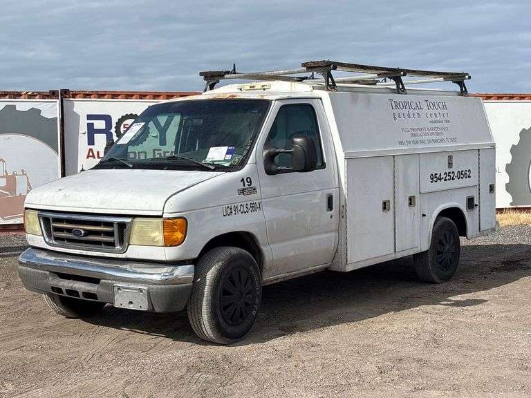 VIN:1FDSE35L55HA46619 Odom Reads N/A mileage on title reads exempt pwd by 5.4L V8 gas engine, automatic transmission. Equipped with: Kanpheide enclosed service body w/ cargo compartments, interior steel shelving, ladder rack, work lights, tow package, GVWR 9,600 lbs, front GAWR 3,800 lbs, and rear GAWR 6,084 lbs, steering wheel cruise, am/fm stereo, AC/heat. Runs and drives. Limited function check completed during check in.