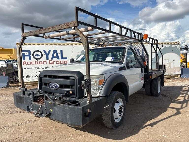 VIN:1FDUF5HY0CEB10394 Odom Reads 67,521 miles, pwd by 6.8L V10 gas engine, automatic transmission. Equipped with: 8FT flatbed body, utility racks, wooden deck, four wheel drive 4WD, tow ball hitch, Gardner Denver HydraPak hydraulic cooler system, work lights, dual rear wheels, GVWR 18,000 lbs, front GAWR 6,000 lbs, and rear GAWR 13,660 lbs, pwr windows, mirrors and locks, steering wheel cruise and media controls, hands free phone system, am/fm/cd stereo, AC/heat. Runs and drives. Limited function check completed during check in.