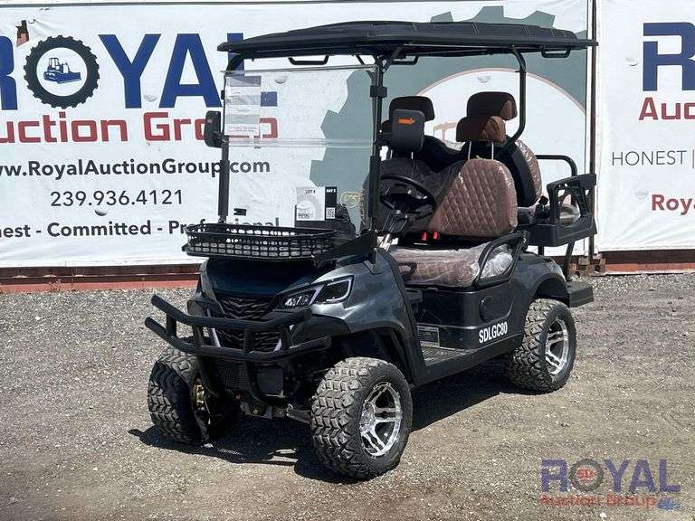 SN: Odom reads: 0 miles , Powered by 60V battery. Equipped with: front bumper and light protection, front utility basket, four passenger seating with seat belts, rear seat folds down to a platform, rear hand rail, folding windshield, mirrors four-post ROPS, canopy cover, LED display screen, Bluetooth connectivity, backup camera, two locked storage compartments. Runs and drives. Limited function check completed at check in.