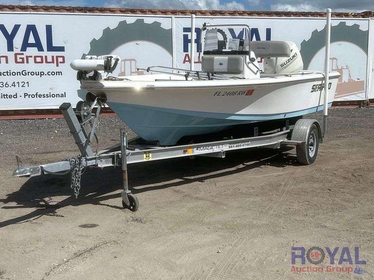 HIN SPBJH071L718 Hours read 24 hrs, 144 engine hours. Pwd. by 70HP Suzuki outboard motor. Equipped with 5 person max seating, Fusion am/fm stereo, rod holders, Minntonka trolling motor, Simrad fish finder and GPS, fiberglass hull. Runs and operates. Limited function check completed at check in. 14t. Magic Tilt single axle boat trailer included.