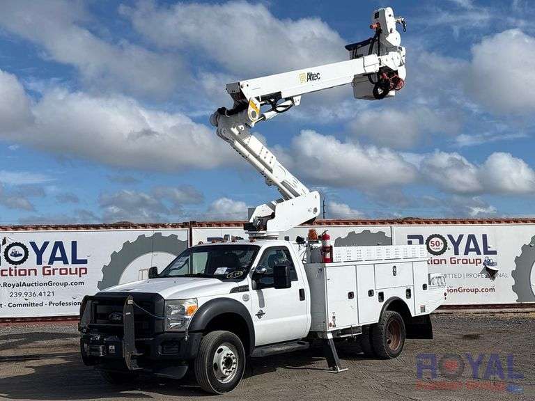 VIN: 1FDUF5GT7FEC37041, Odom Reads: 123,879 miles. Powered by a Powered by a Power Stroke 6.7L V8 Turbo Diesel Engine, Automatic Transmission. Equipped with Altec AT40M 40ft 400lb capacity electrically insulated material handling bucket body, dual mid mounted hydraulic stabilizers, front mounted Ramsey cable winch, upper and lower bucket controls, tow package, dual wheel rear axle, work platform, PTO switch, work lights, steering wheel cruise controls, AM/FM stereo, climate controls, 12V charging. Runs, drives, and operates, Limited function check completed at check in.