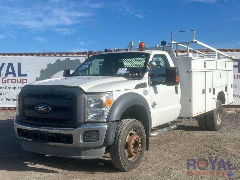 VIN: 1FDUF5GT2CED10246, Odom Reads: 118,864 miles. Powered by a Power Stroke 6.7L V8 Turbo Diesel Engine, Automatic Transmission. Equipped with Knapheide service body, hydraulic tailgate lift, tow package, dual wheel rear axle, toolbox, power windows, locks, and mirrors, steering wheel cruise controls, AM/FM stereo, CD player, auxiliary switches, work lights, AUX input, climate controls, 12V charging. Runs and drives, Limited function check completed at check in.