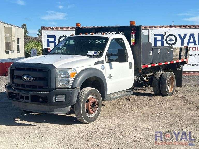 VIN: 1FDTF4GT1GEC31999, Odom Reads: 97,059 miles. Powered by a Power Stroke 6.7L V8 Turbo Diesel Engine, Automatic Transmission. Equipped with flatbed service body with metal cargo boxes and wood railing, tow package, dual wheel rear axle, work lights, Muncie PTO switch, steering wheel cruise controls, auxiliary switches, AM/FM stereo, climate controls, 12V charging. Runs and drives, Limited function check completed at check in.