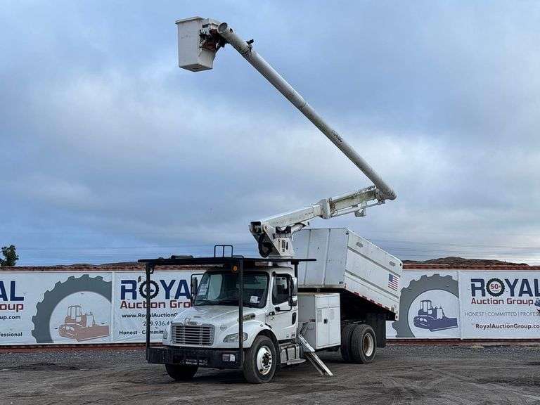 VIN: 1FVACWDT1CHBV7634, Odom Reads 97,472 miles, pwd by Cummins 6.7L 6-cylinder diesel engine, automatic transmission. Equipped with: Altec LRV36 bucket boom, 36ft platform height, 350lb capacity, forestry chipper body, hydraulic hoist, two mid hydraulic stabilizers, landing deck, 4x2 drive line, dual rear wheels, GVWR 26,000 lbs, storage compartments, air brakes, PTO switches, am/fm stereo, AC/heat. Runs, drives and operates. Limited function check completed during check in.