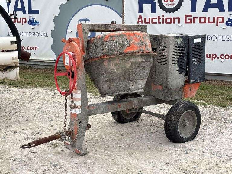 City of Sanford, SN: 3990278. Powered by a Honda GX240 Gasoline Engine. Equipped with 9 cubic foot mixing hopper, hand wheel, engine enclosure, tow hitch. Unknown working condition, no pull string for engine noted. Limited function check completed at check in.